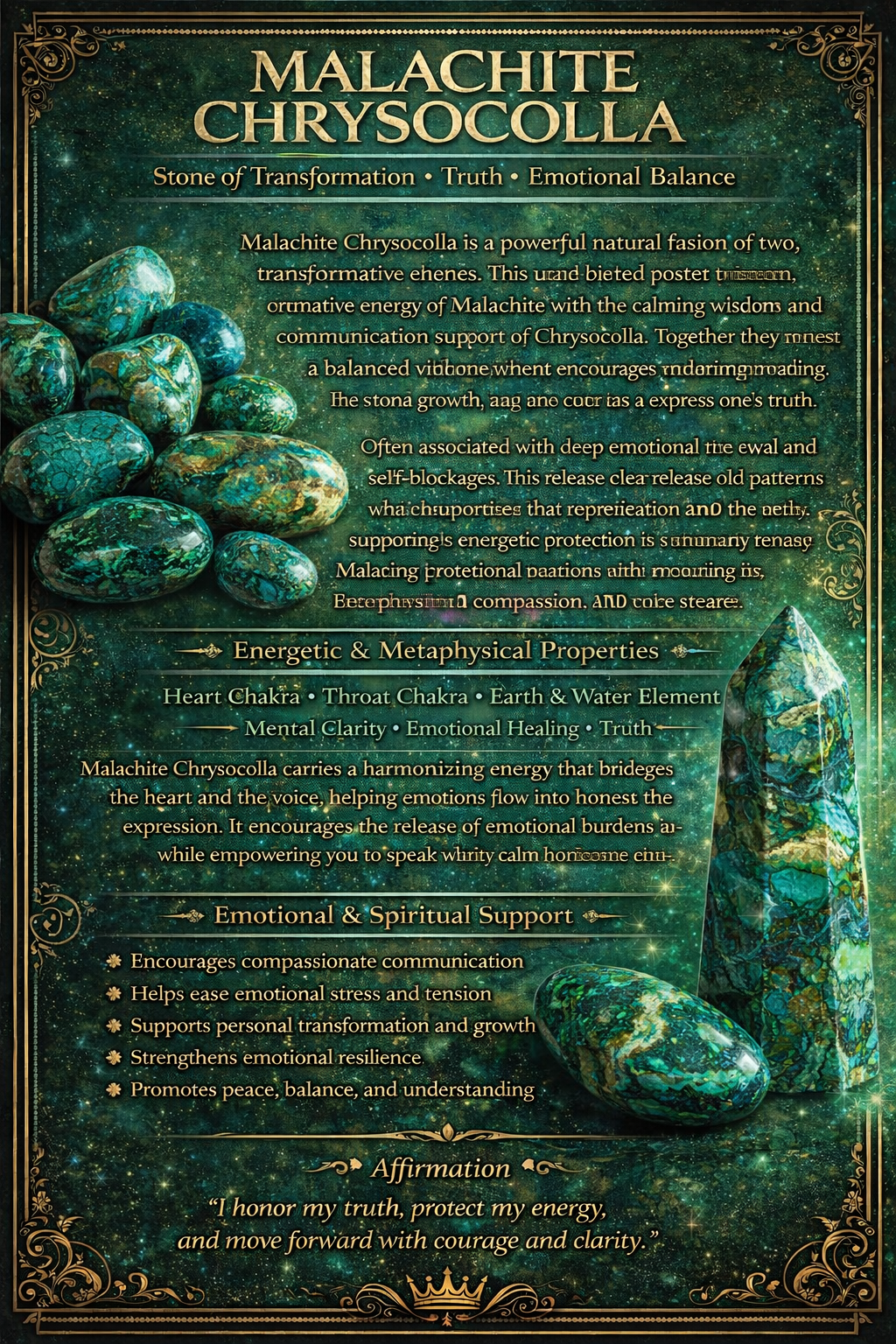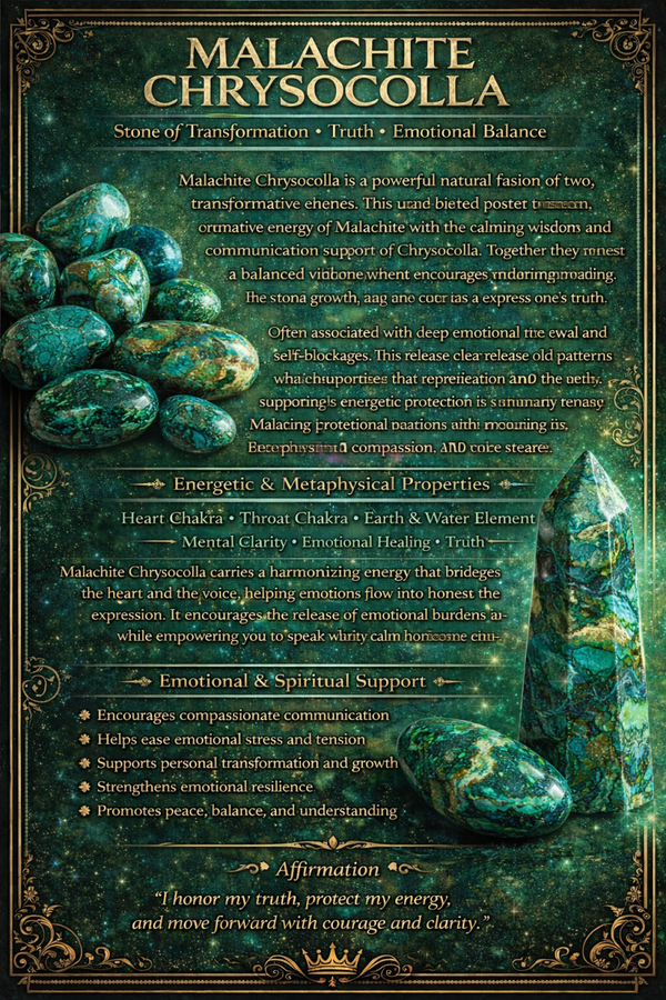Malachite has long been known as a stone of protection and personal evolution. It is believed to absorb negative energies while encouraging the wearer to release old emotional patterns and step confidently into transformation. Chrysocolla complements this energy beautifully, offering calm, wisdom, and the ability to speak one's truth with clarity and compassion.