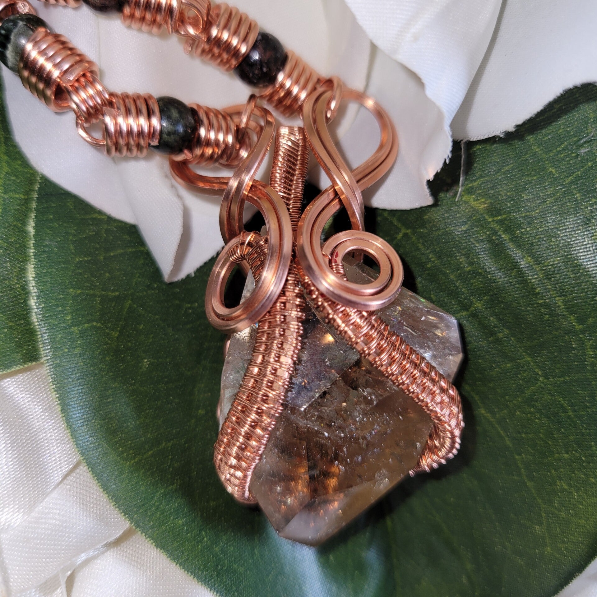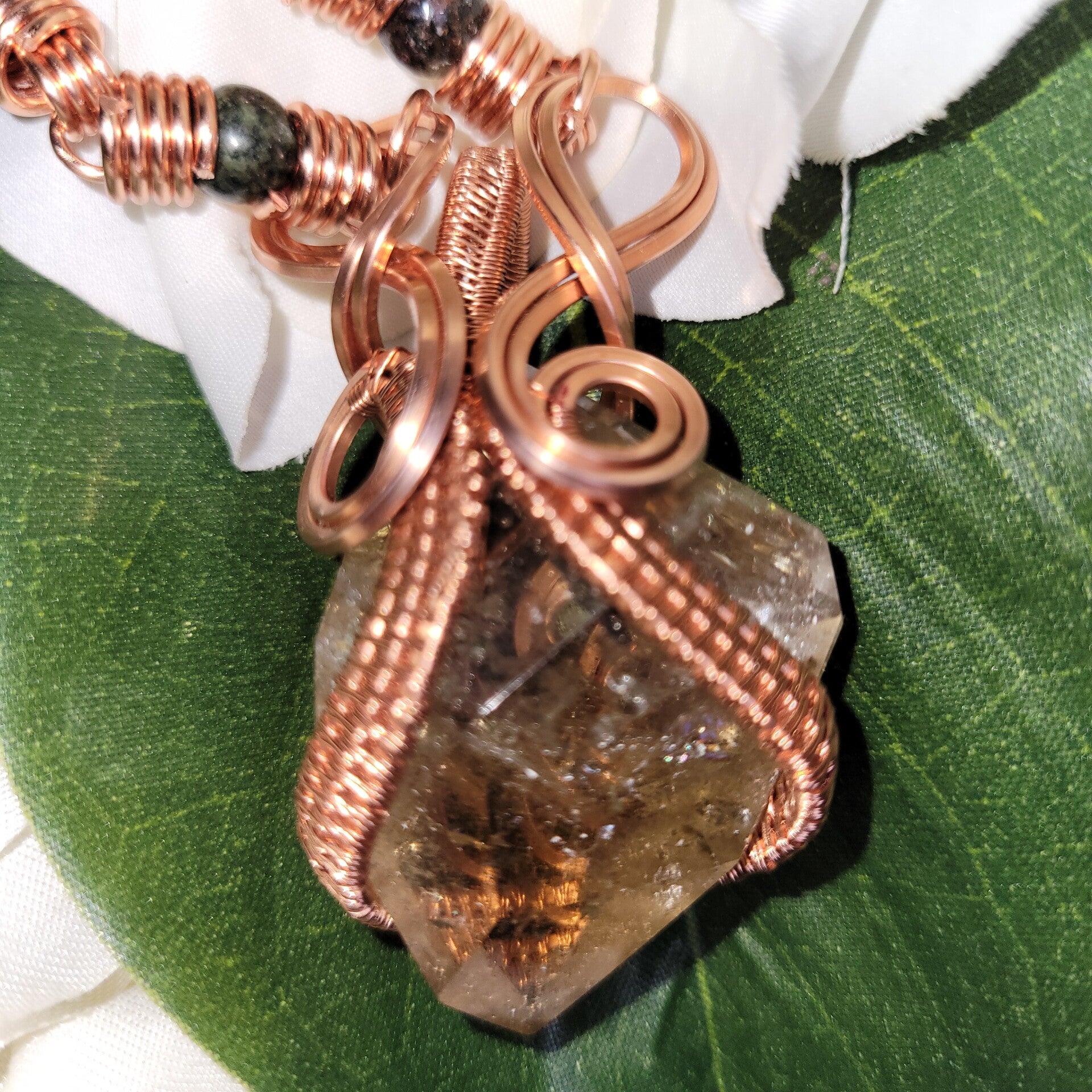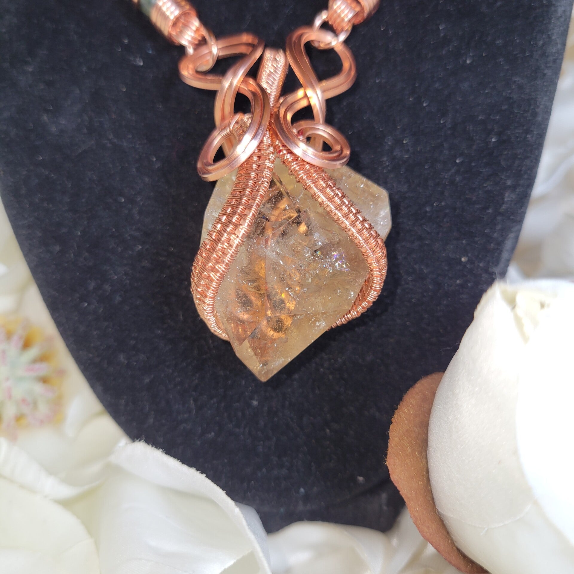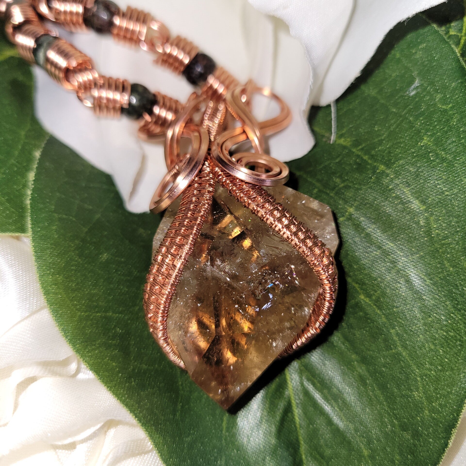 Cyravoné is a radiant handcrafted talisman centered around a luminous citrine double-terminated point crowned in Jewelscrwn’s signature copper wrap and suspended from a bold handcrafted copper chain. The citrine glows with warm golden light and subtle internal rainbows that allow sunlight to travel through the stone as it hangs beneath its sculpted crown. The copper wrap secures the crystal while honoring its natural geometry, allowing the powerful point to remain fully visible and alive with light.