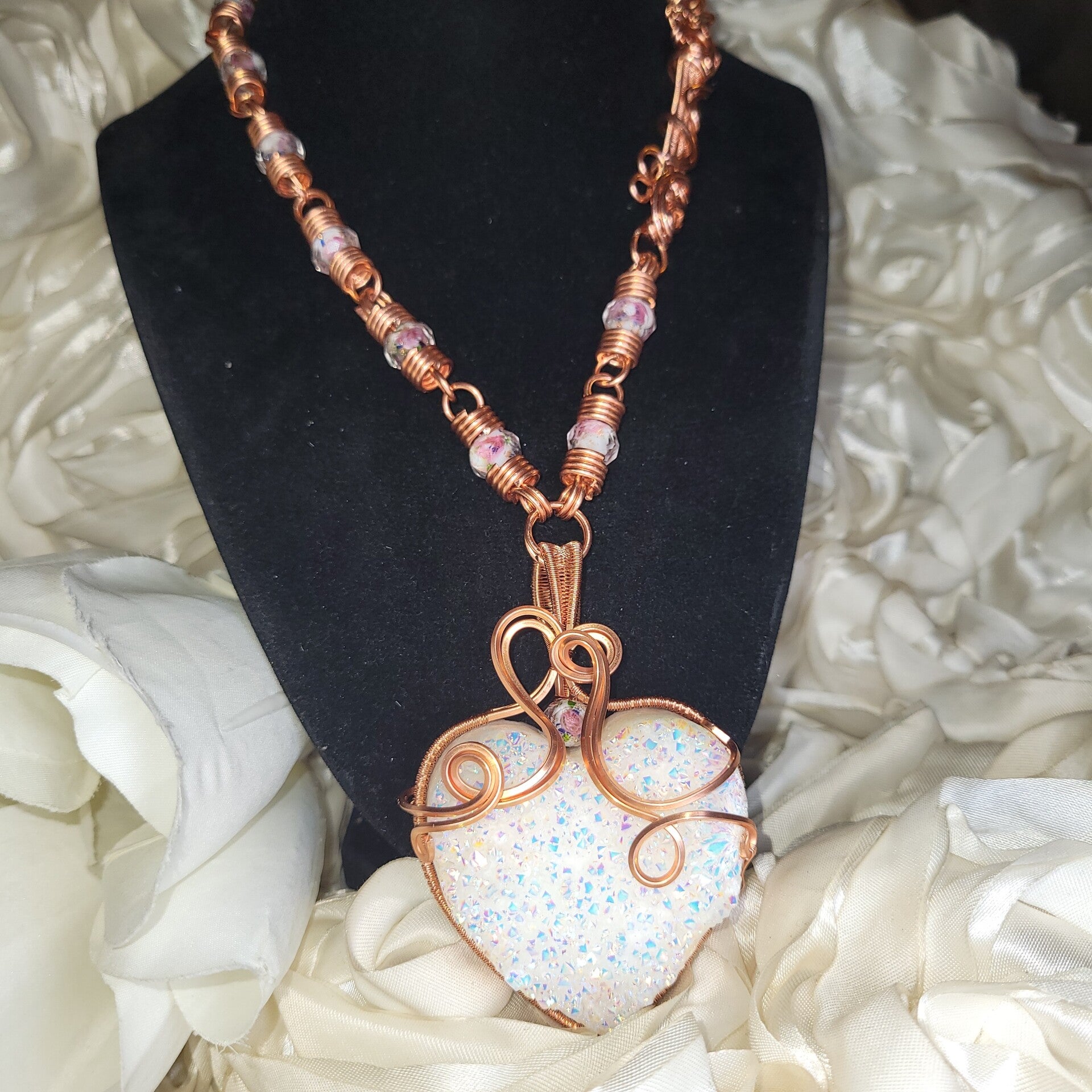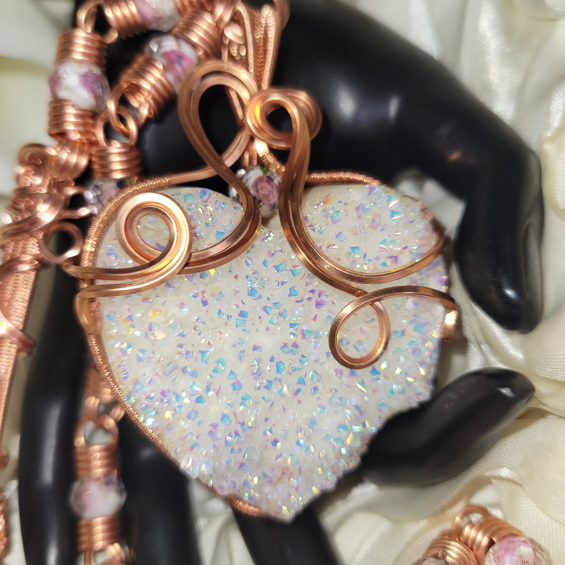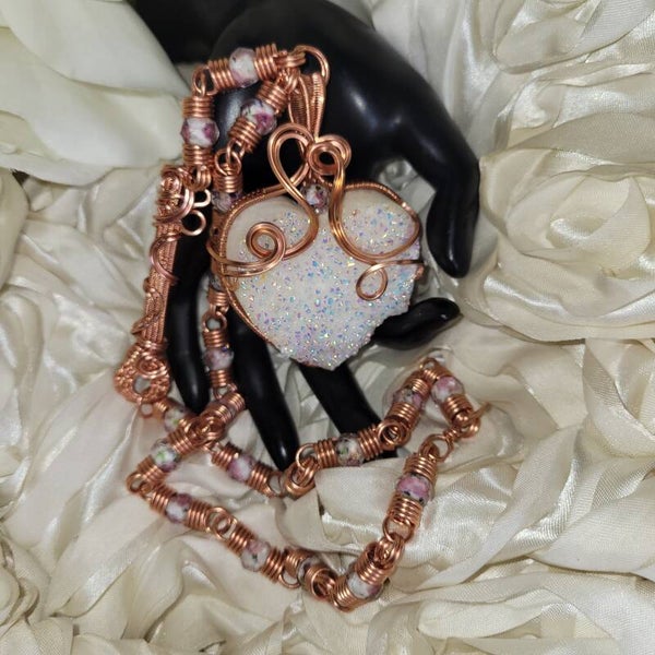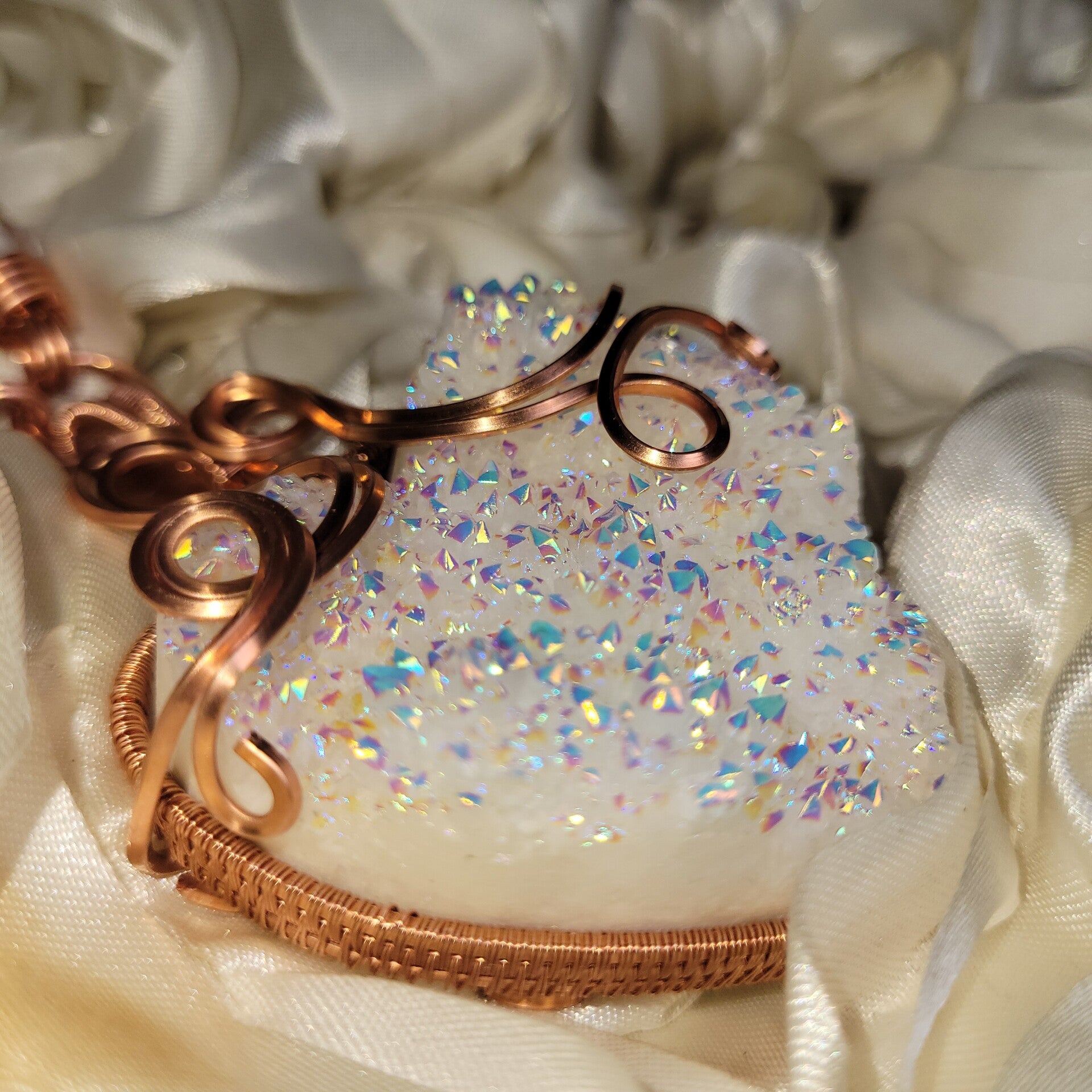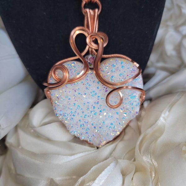 Avenyra is a luminous heart born from light itself — an Angel Aura coated druzy quartz shimmering with iridescent fire, wrapped in flowing copper that moves like breath through emotion. She carries a quiet power, one that doesn’t force open doors, but gently reveals them. At the center of her essence lies a truth many forget — that the heart is not meant to stay closed, only protected until it is safe to open again.