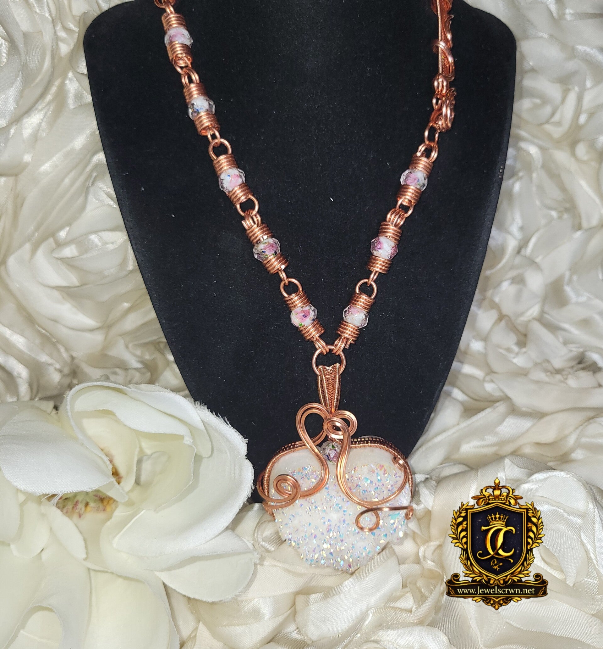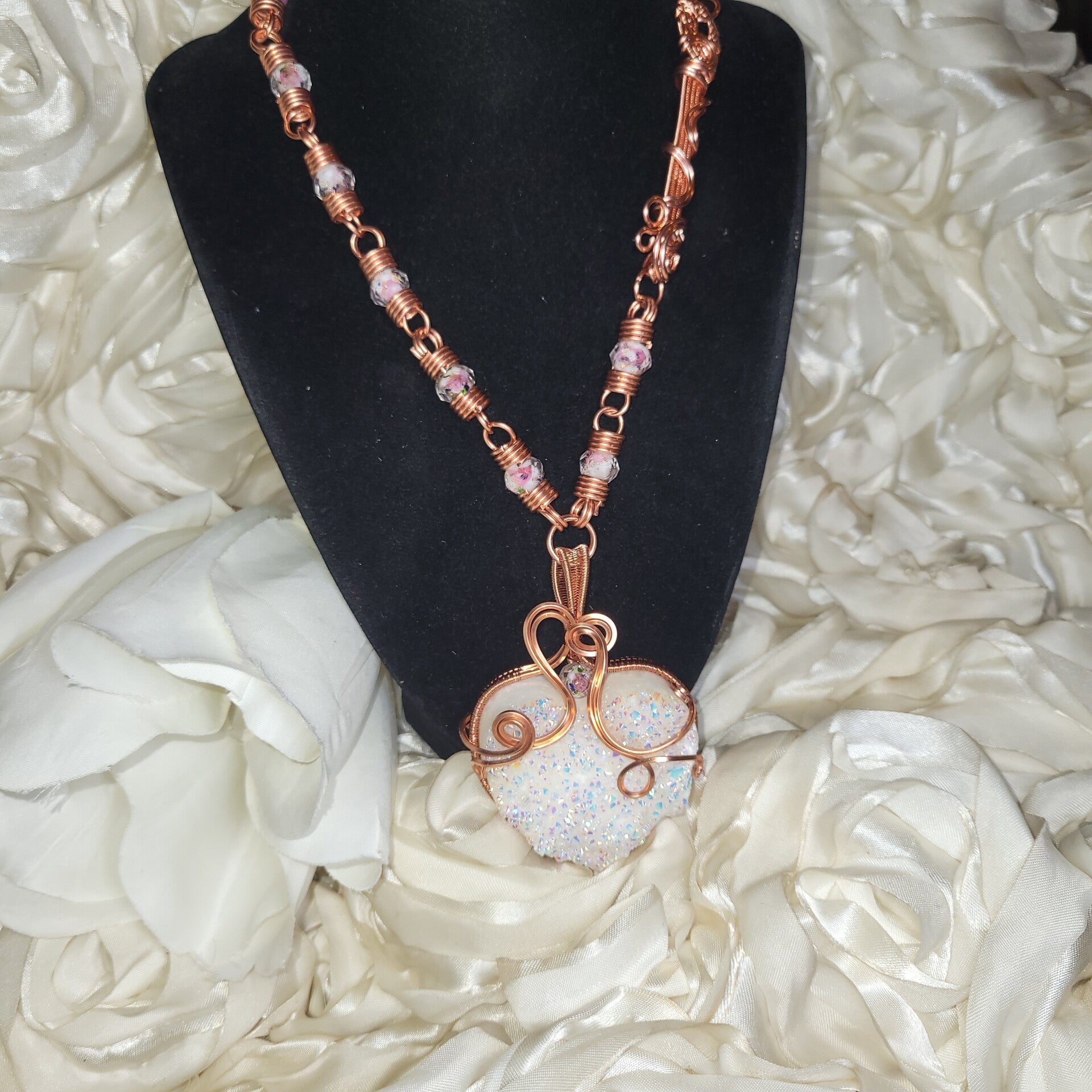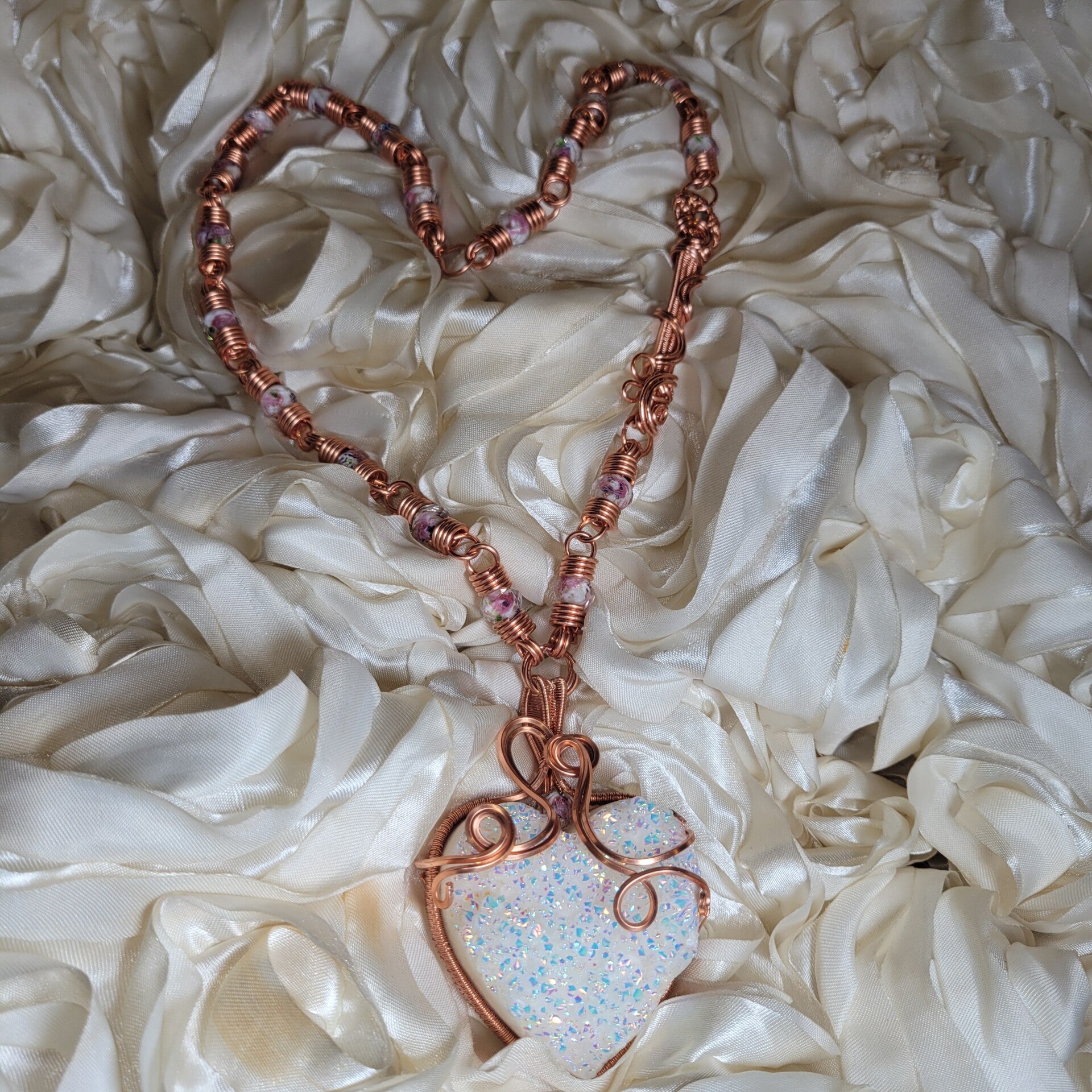 Avenyra is a luminous heart born from light itself — an Angel Aura coated druzy quartz shimmering with iridescent fire, wrapped in flowing copper that moves like breath through emotion. She carries a quiet power, one that doesn’t force open doors, but gently reveals them. At the center of her essence lies a truth many forget — that the heart is not meant to stay closed, only protected until it is safe to open again.