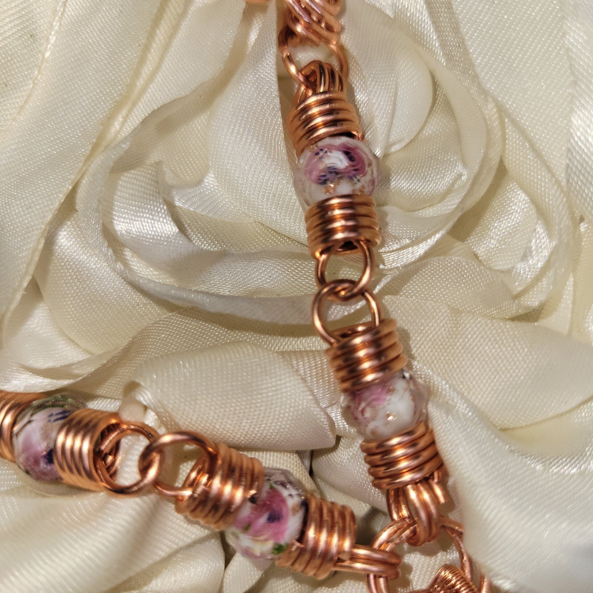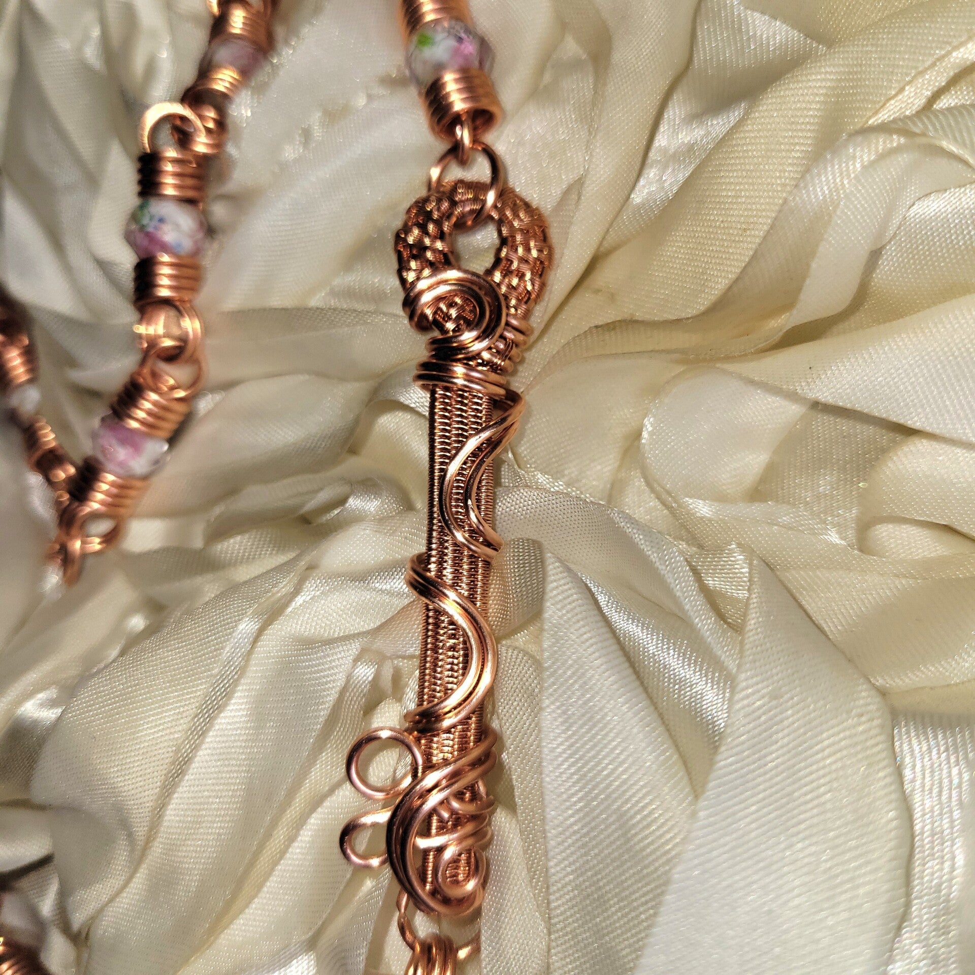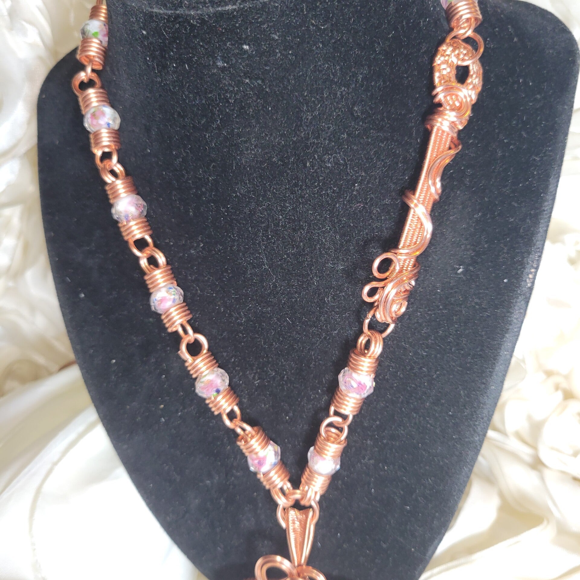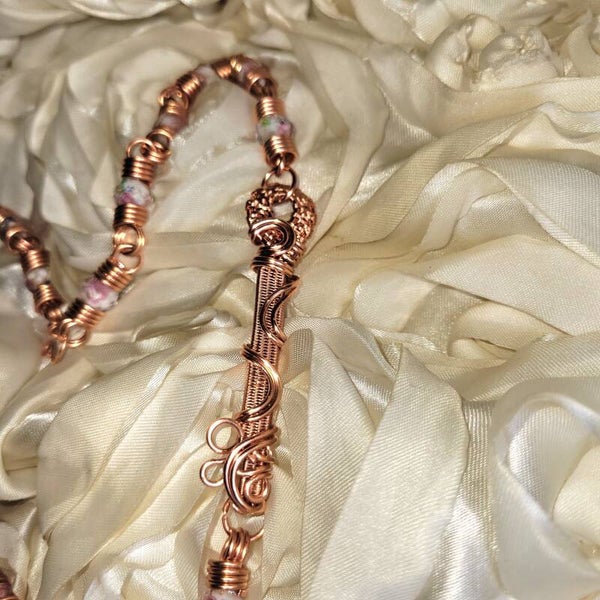 Adorned with soft floral glass beads and anchored by a fully wire-wrapped key woven into her chain, Avenyra is more than a piece — she is a passage. The key does not lead others in, but reminds you that access to your heart is yours to choose. It rests gently behind the centerpiece, just as discernment should — present, but not overpowering.