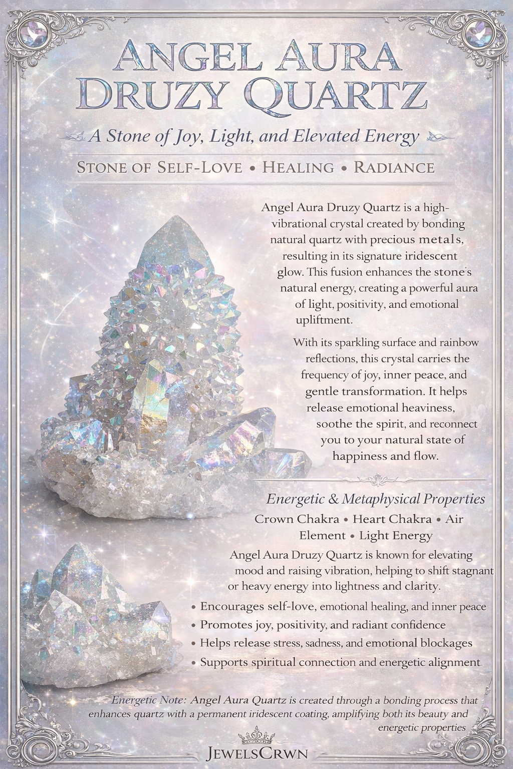 Promotes joy, self-love, and emotional healing while elevating your vibration. Encourages openness, inner peace, and gentle emotional release.