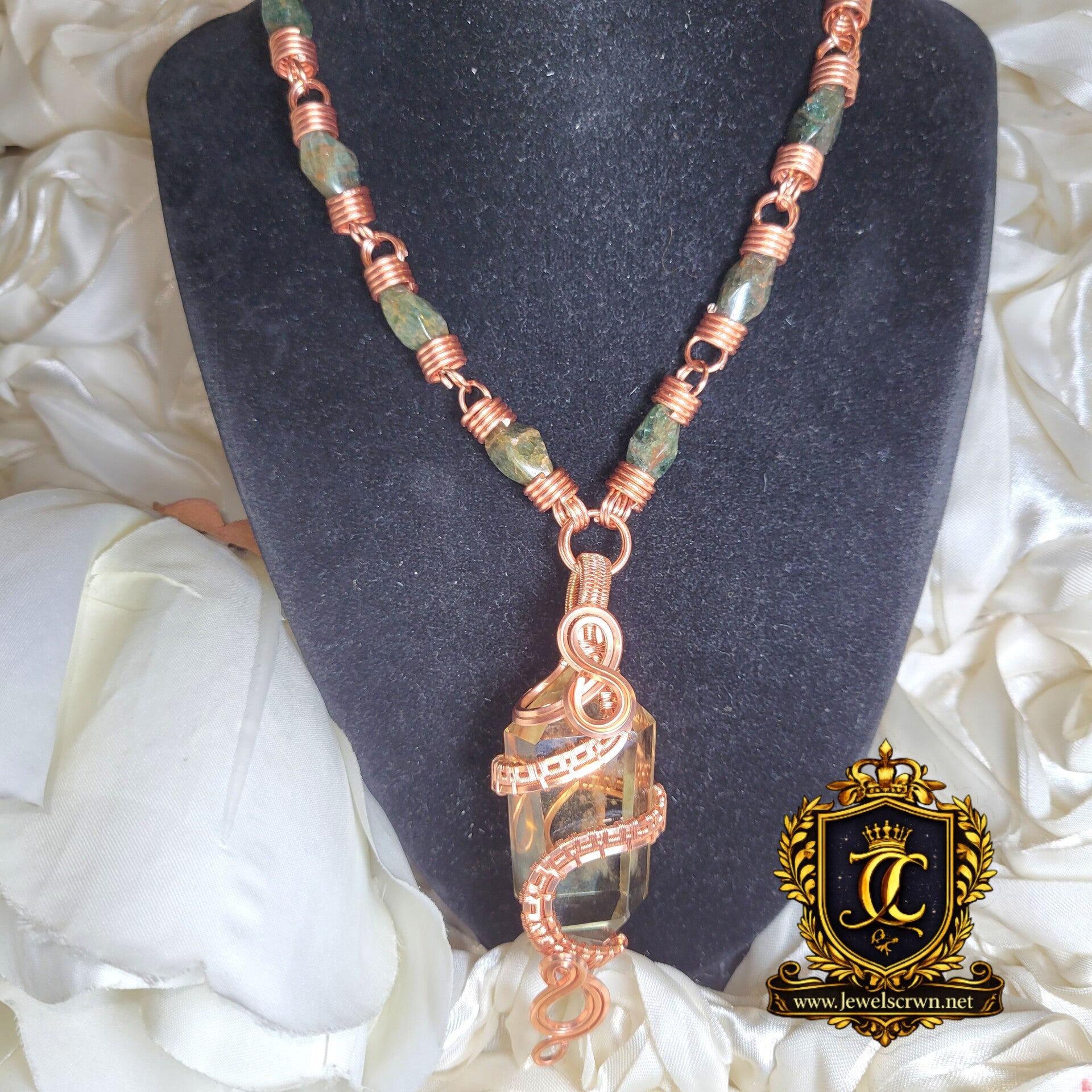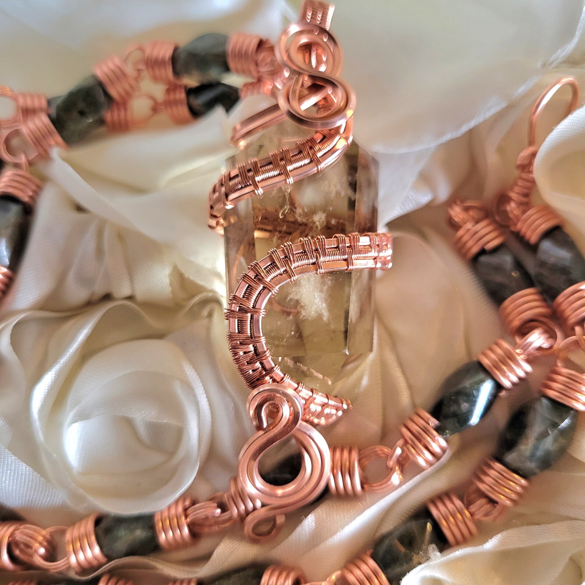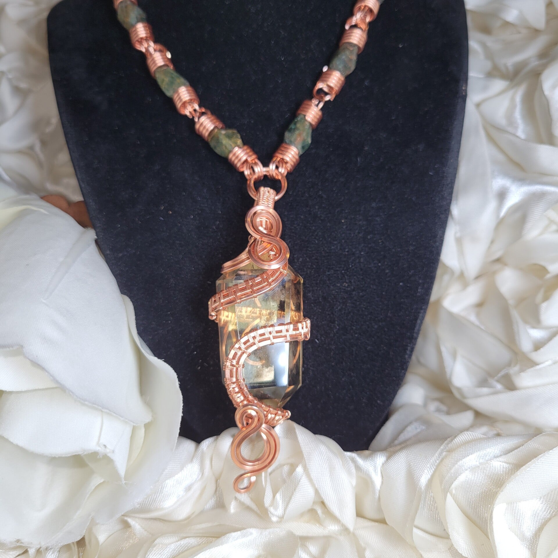 Cazarié is a radiant double-terminated citrine talisman wrapped in warm copper, adorned with deep green garnet beads along a signature handcrafted chain. She carries a soft golden glow, but what sets her apart is the natural phantom inclusion held within her core — a clouded, veil-like formation that captures a previous stage of the crystal’s growth, preserved in time.