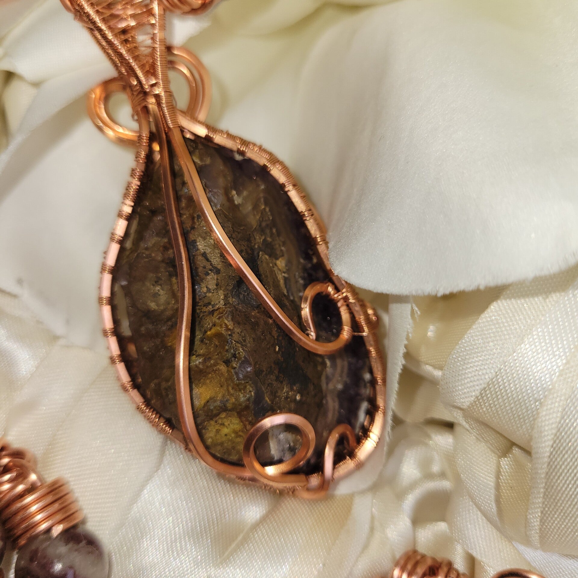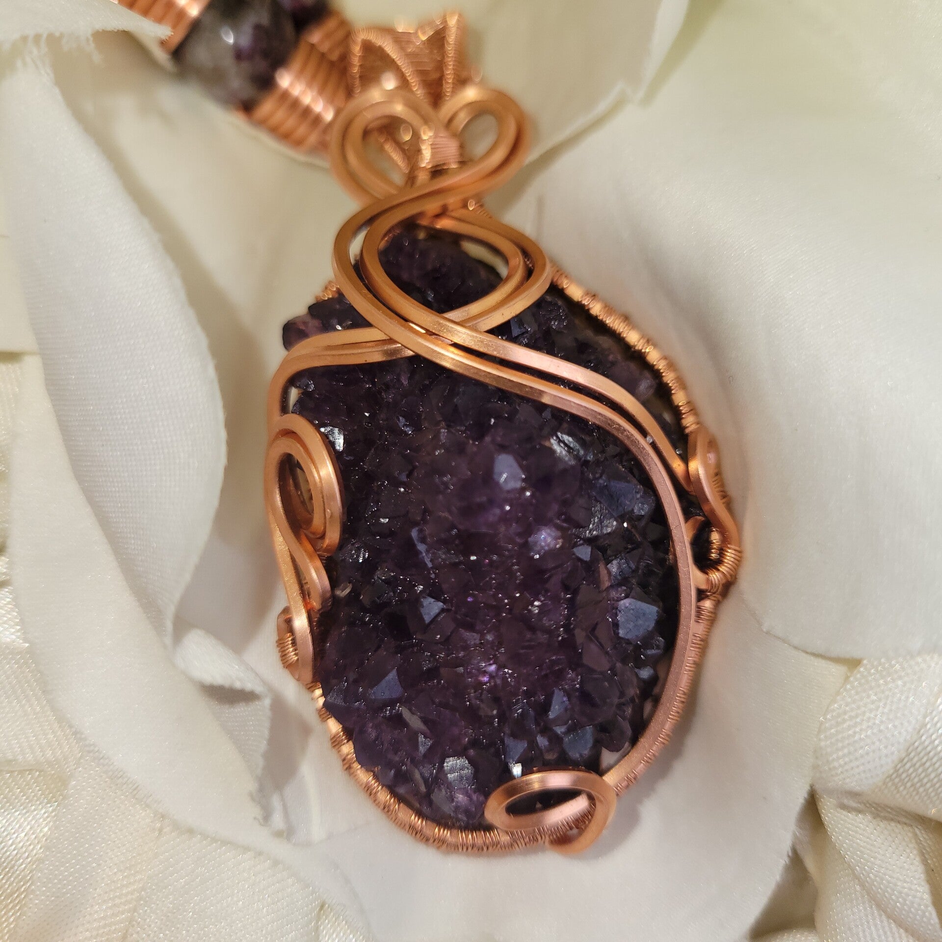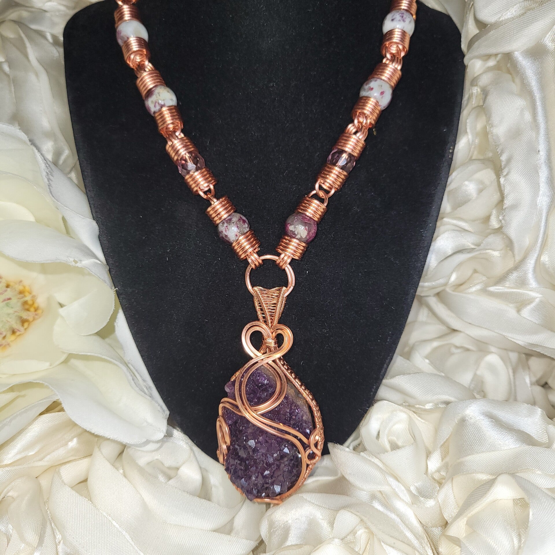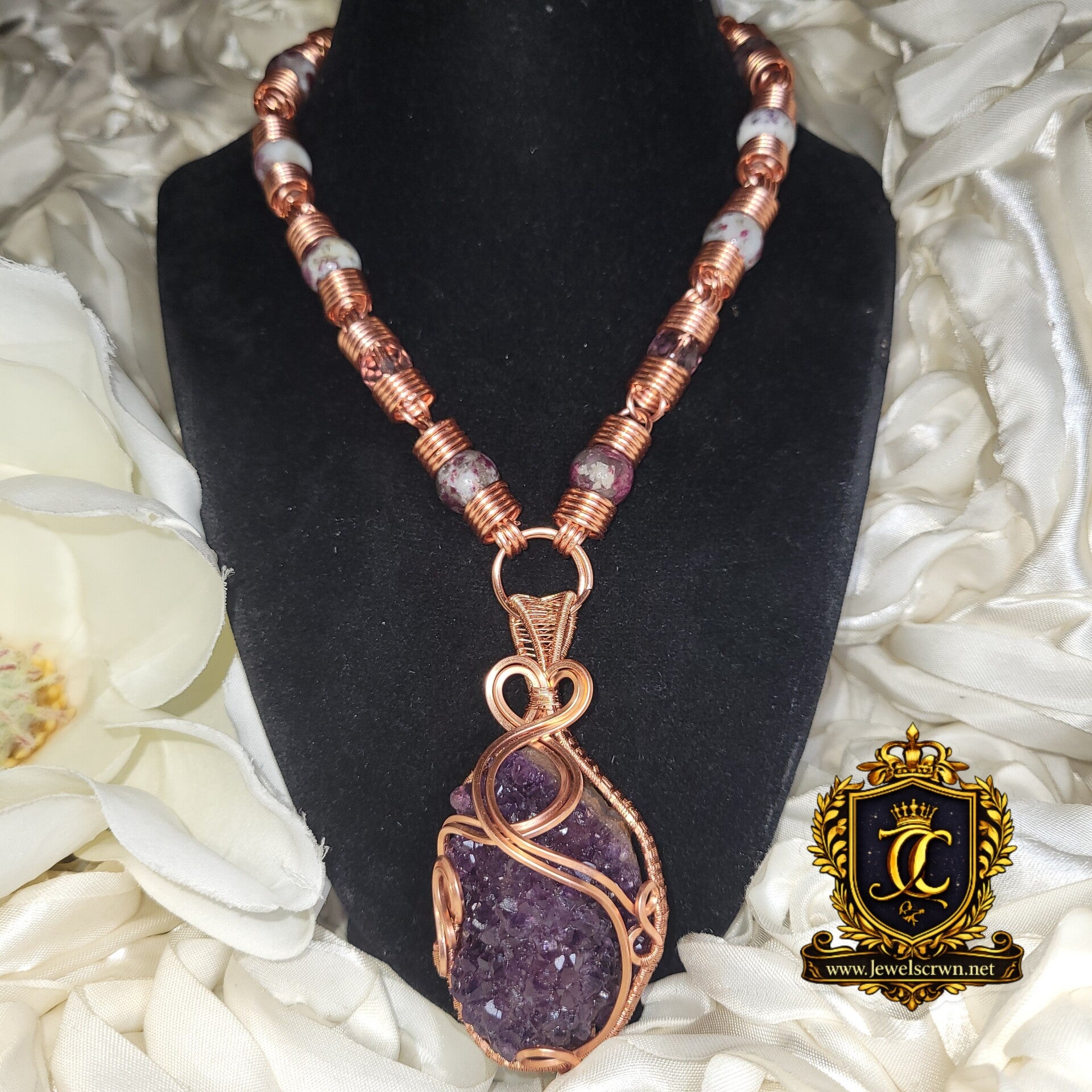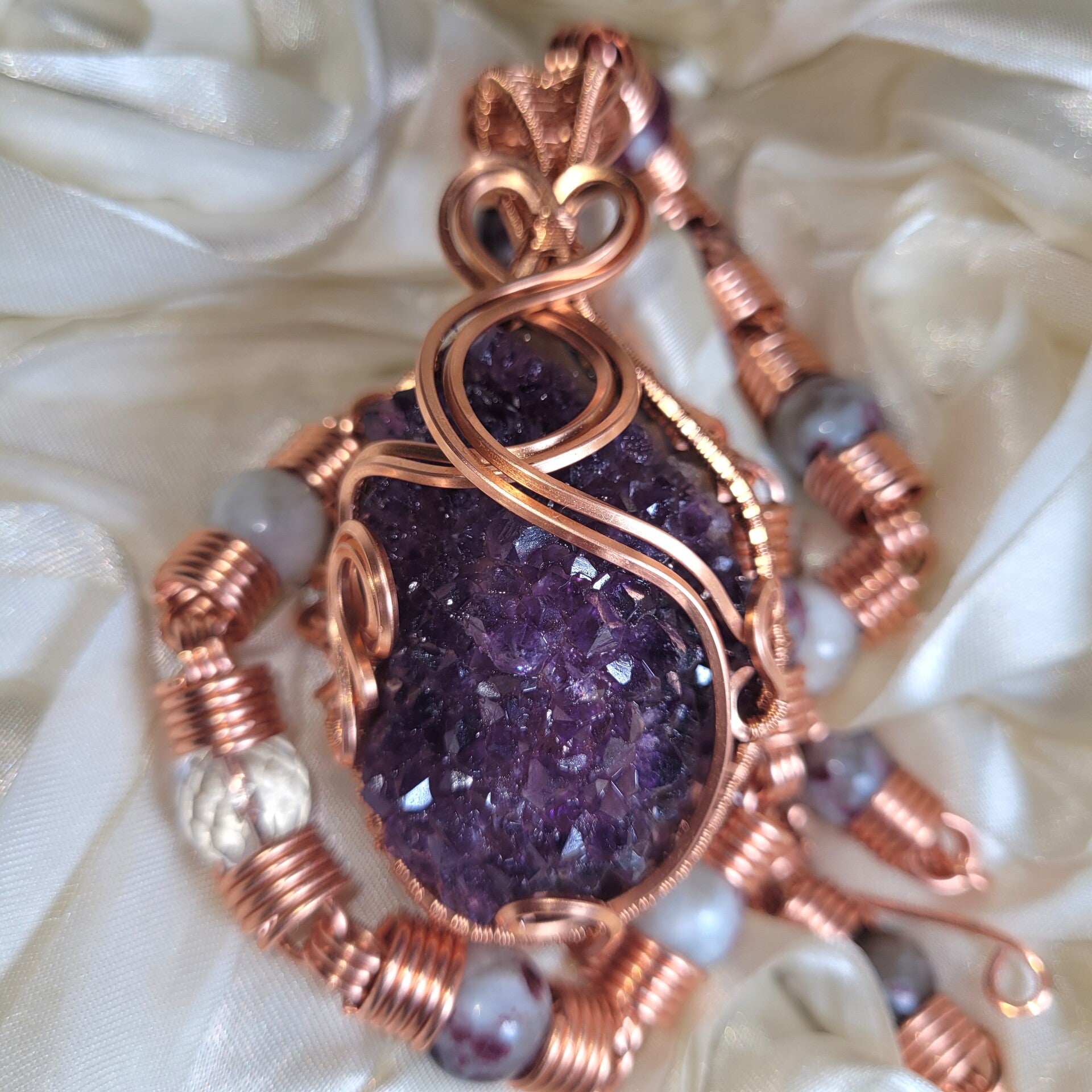 Ravéira is a commanding embodiment of transformation, emotional power, and spiritual elevation, anchored in a raw amethyst cluster that radiates with natural, untamed energy. Her deep violet crystals shimmer with the quiet intensity of inner knowing, wrapped in flowing copper that moves like a living current around her form. Adorned with rich rubellite, soft amethyst, and clear quartz beads, she carries a layered frequency that speaks to both the heart and the higher self.