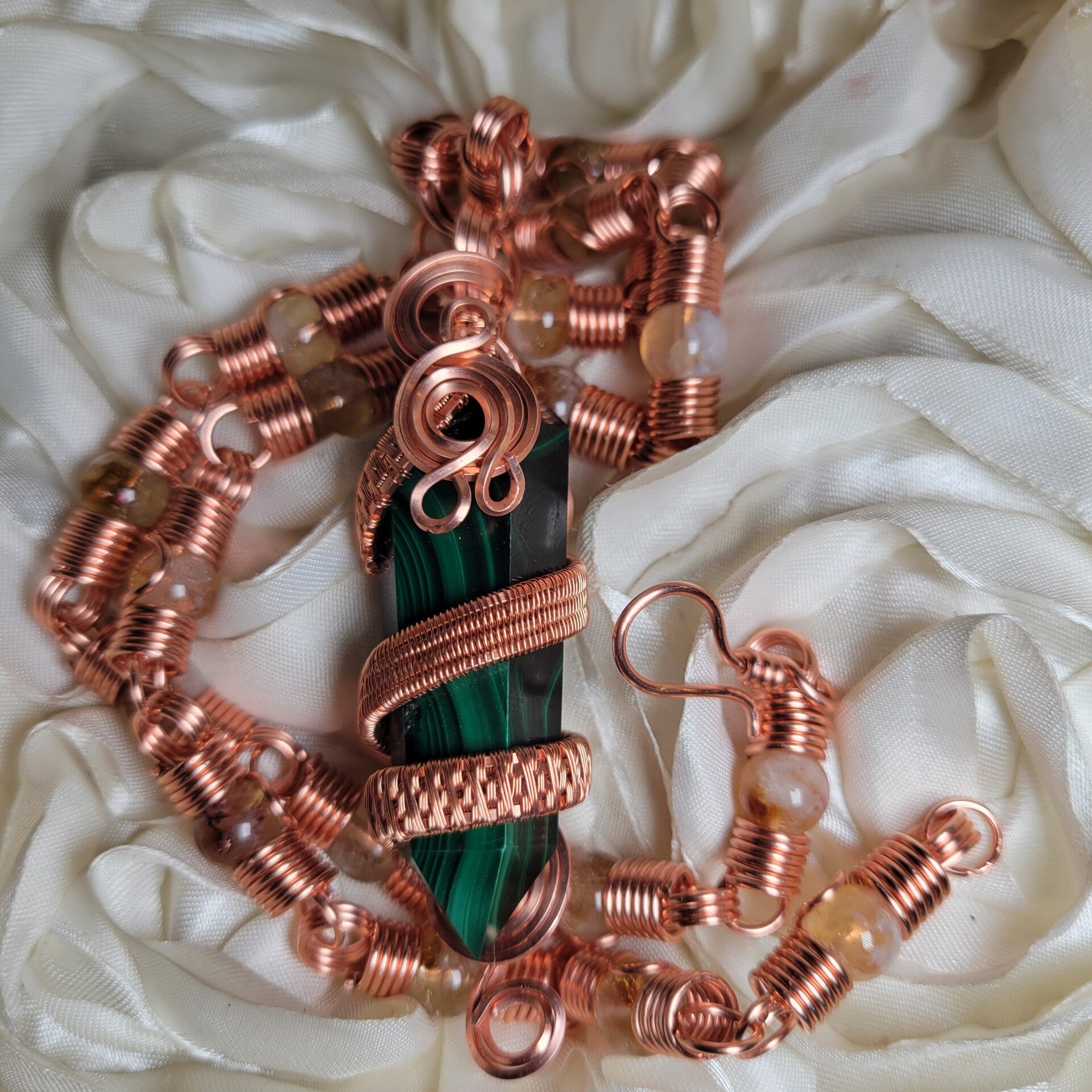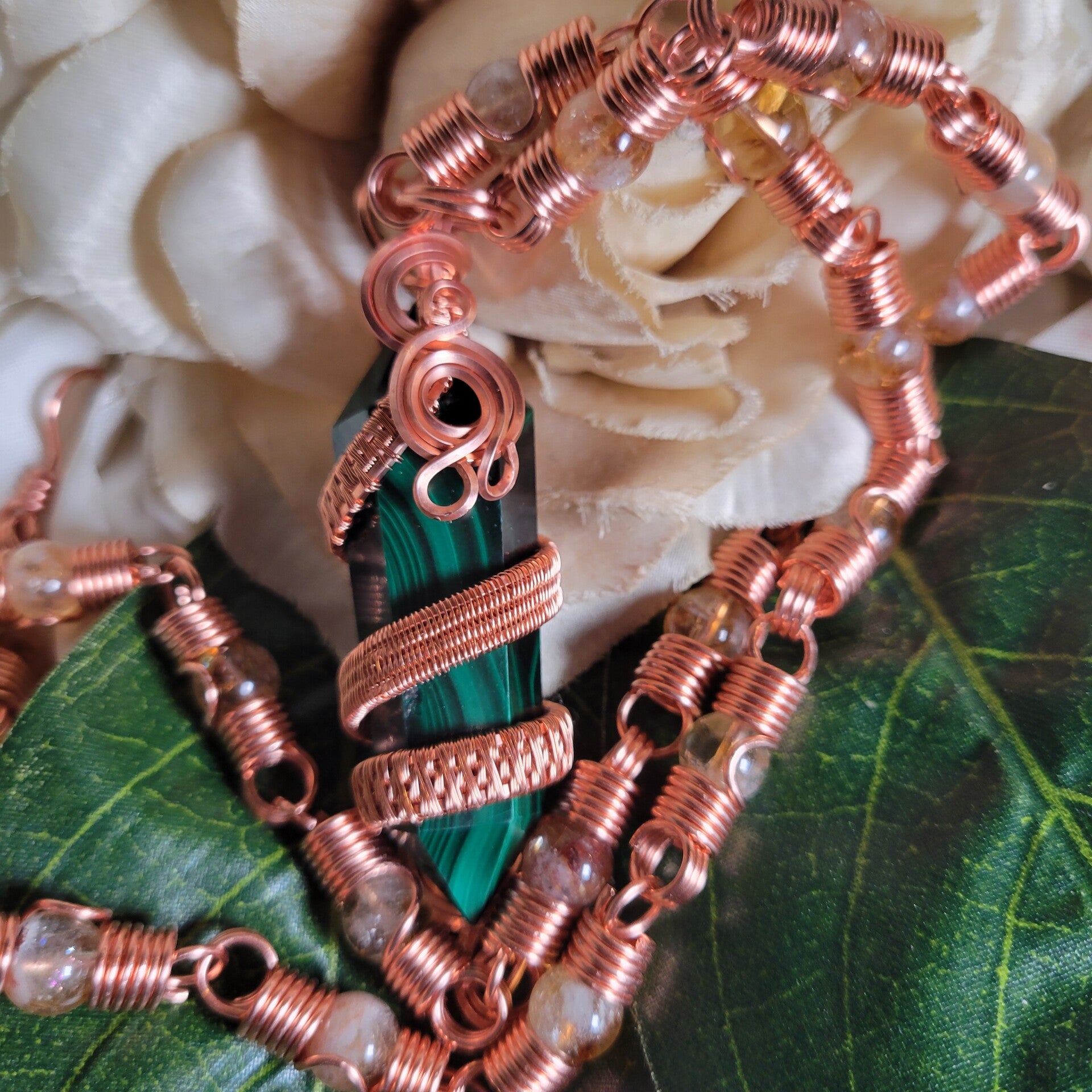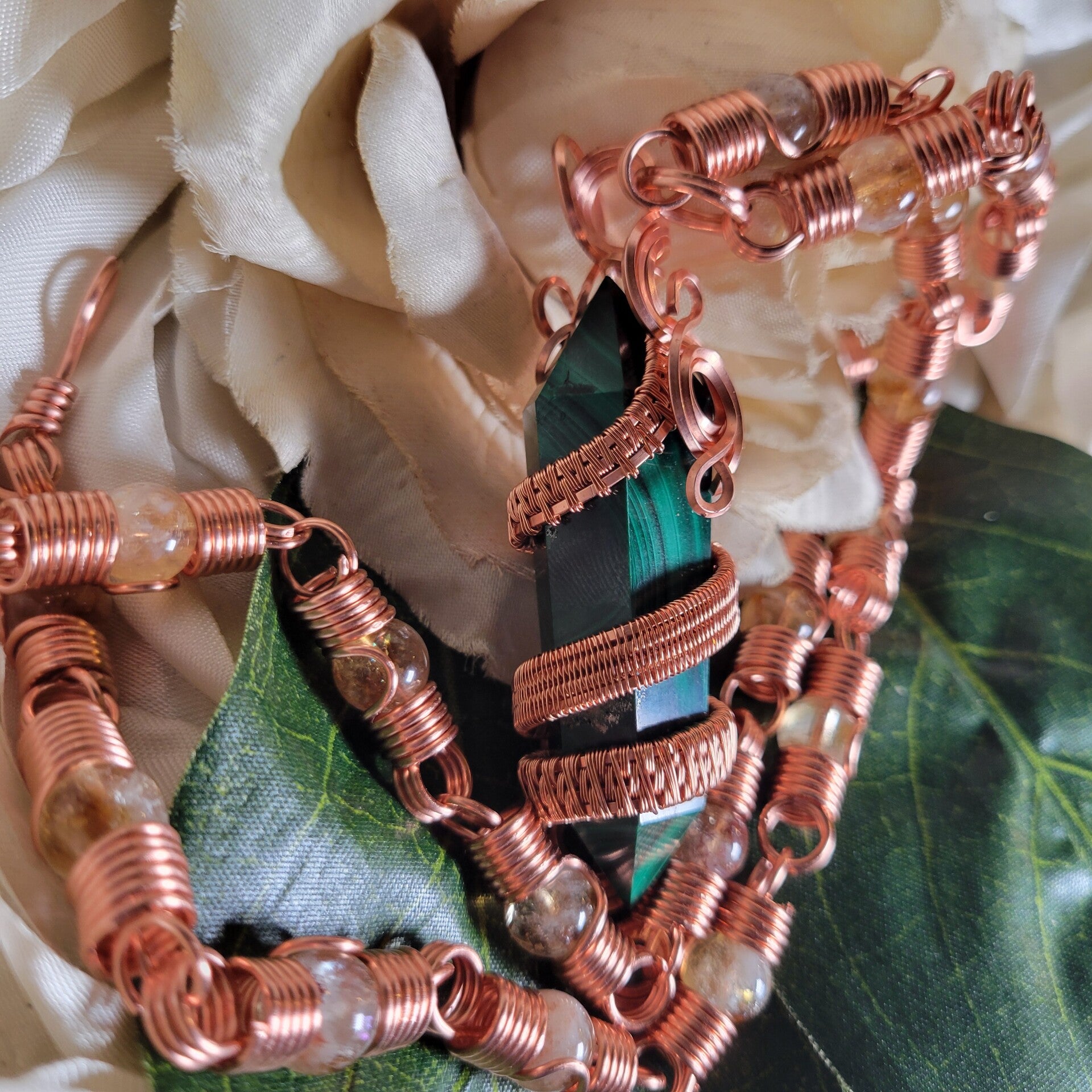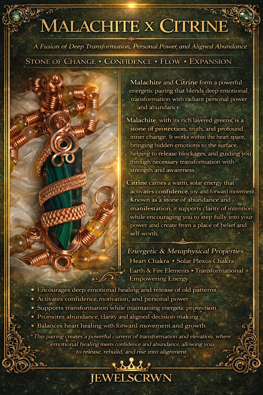 Maréziah is a striking Double Terminated Malachite pendant adorned with Citrine beads and wrapped in flowing copper, created to embody movement, duality, and transformation. Her double terminated shape makes this piece especially powerful, as energy is believed to flow through both ends rather than holding in one fixed direction. That current is echoed in the design itself, because Maréziah has no true front or back. She can be worn either way, allowing the wearer to choose the face of the piece that speaks to them in the moment. This reversible design symbolizes balance, adaptability, and the truth that transformation is never one-sided.