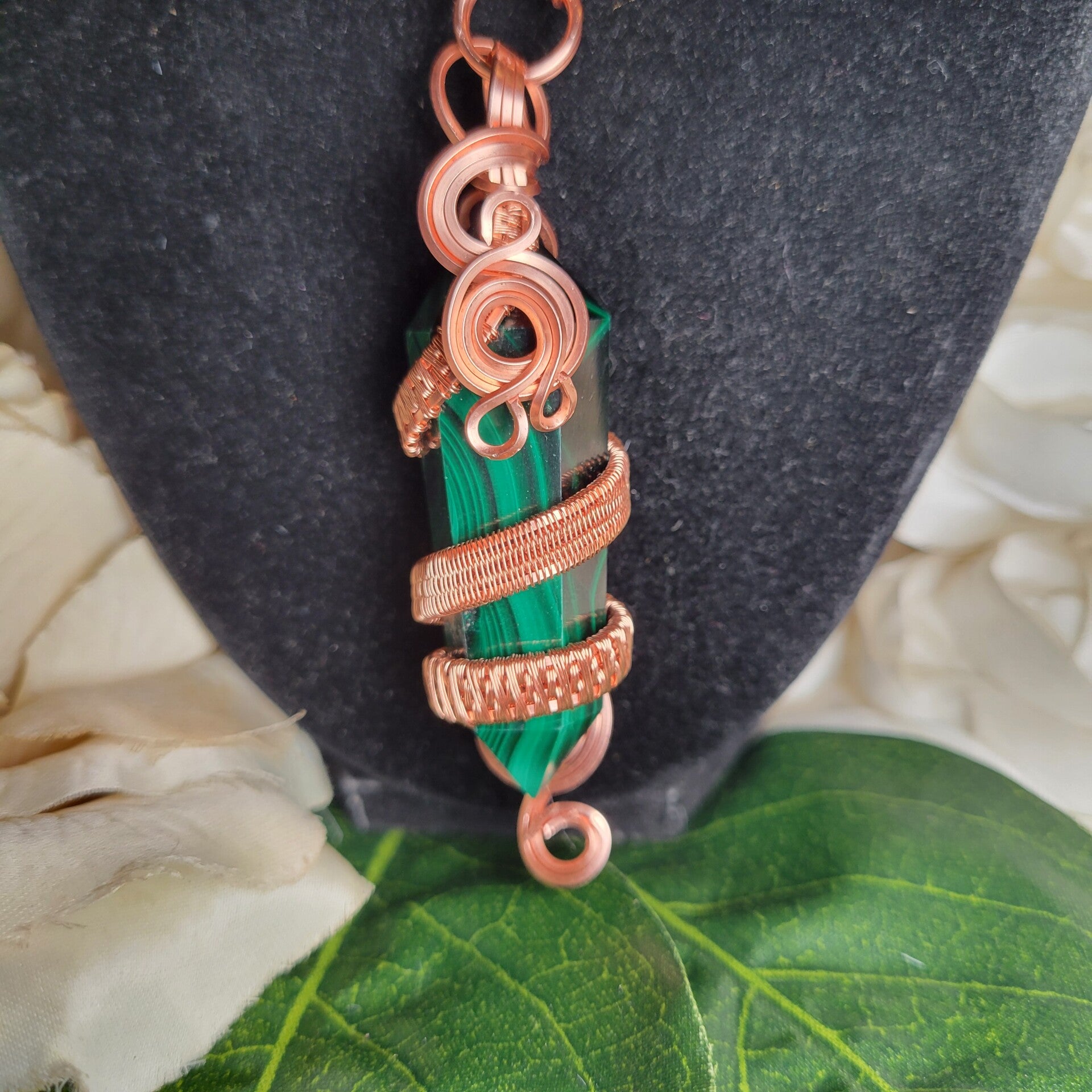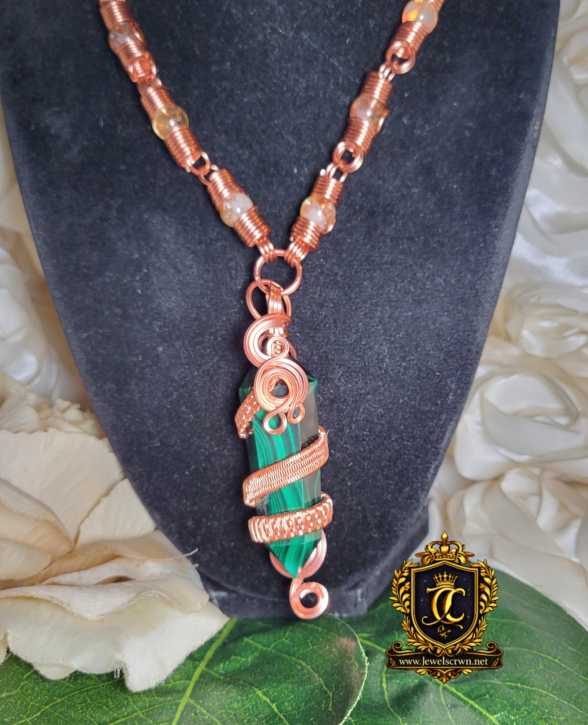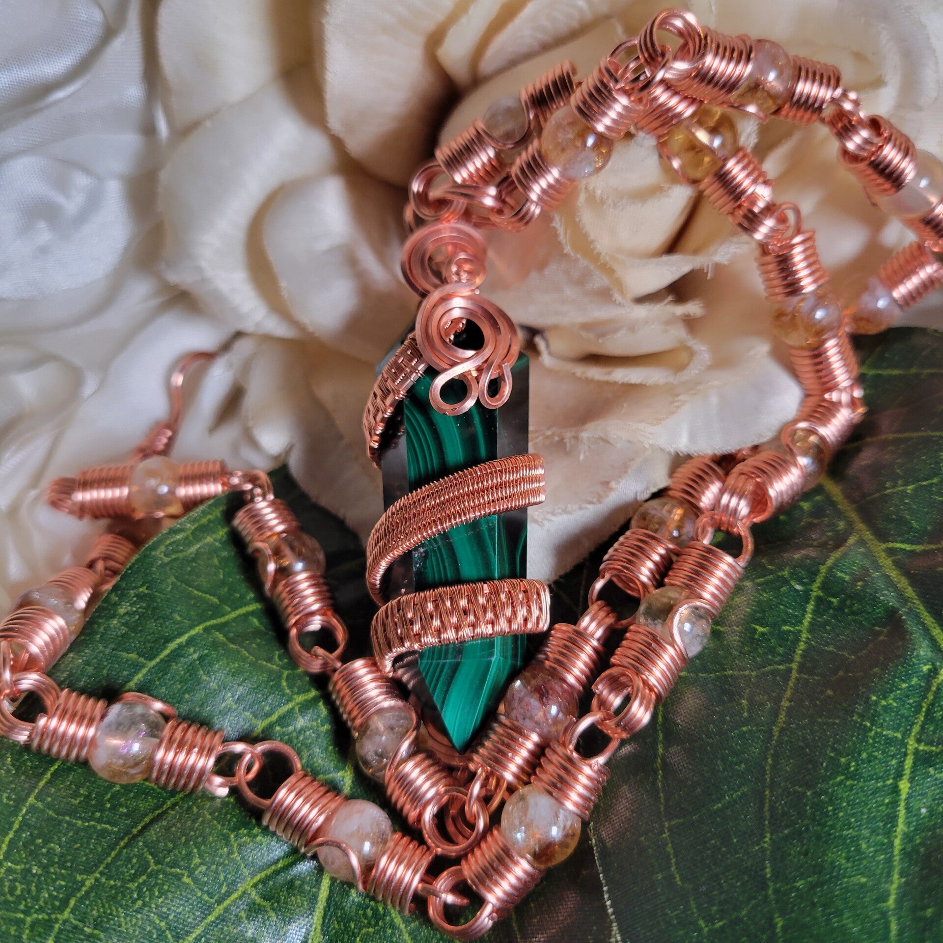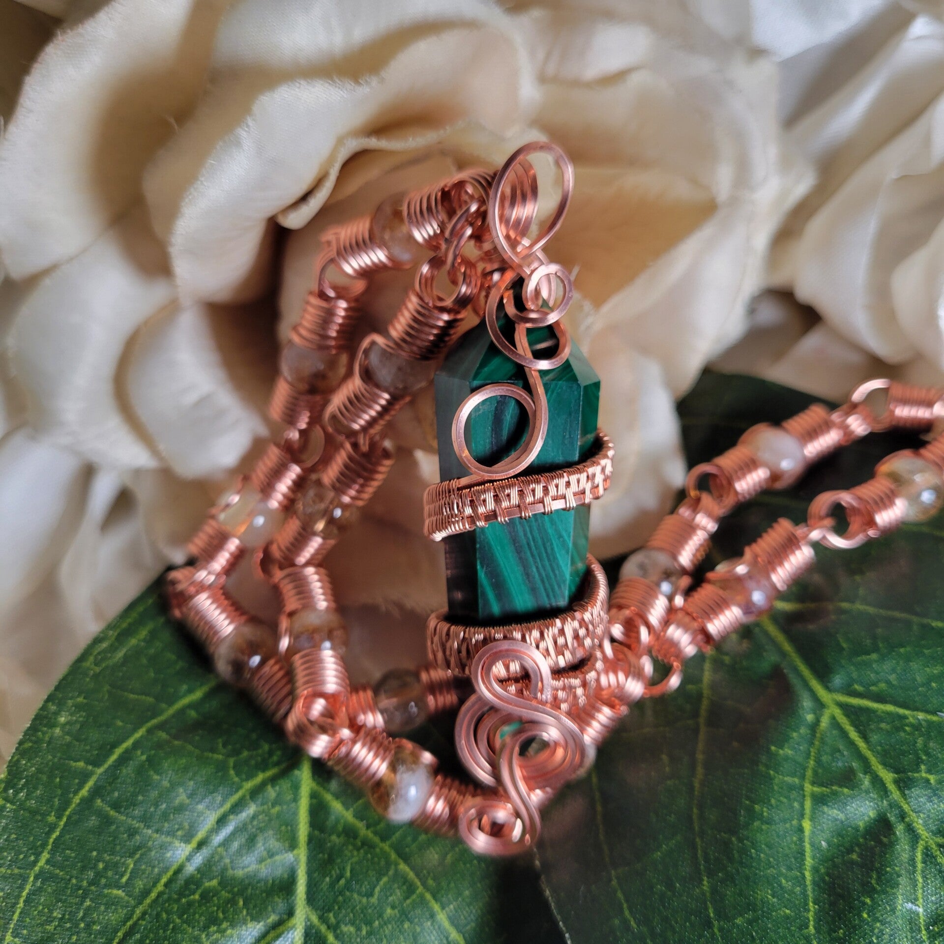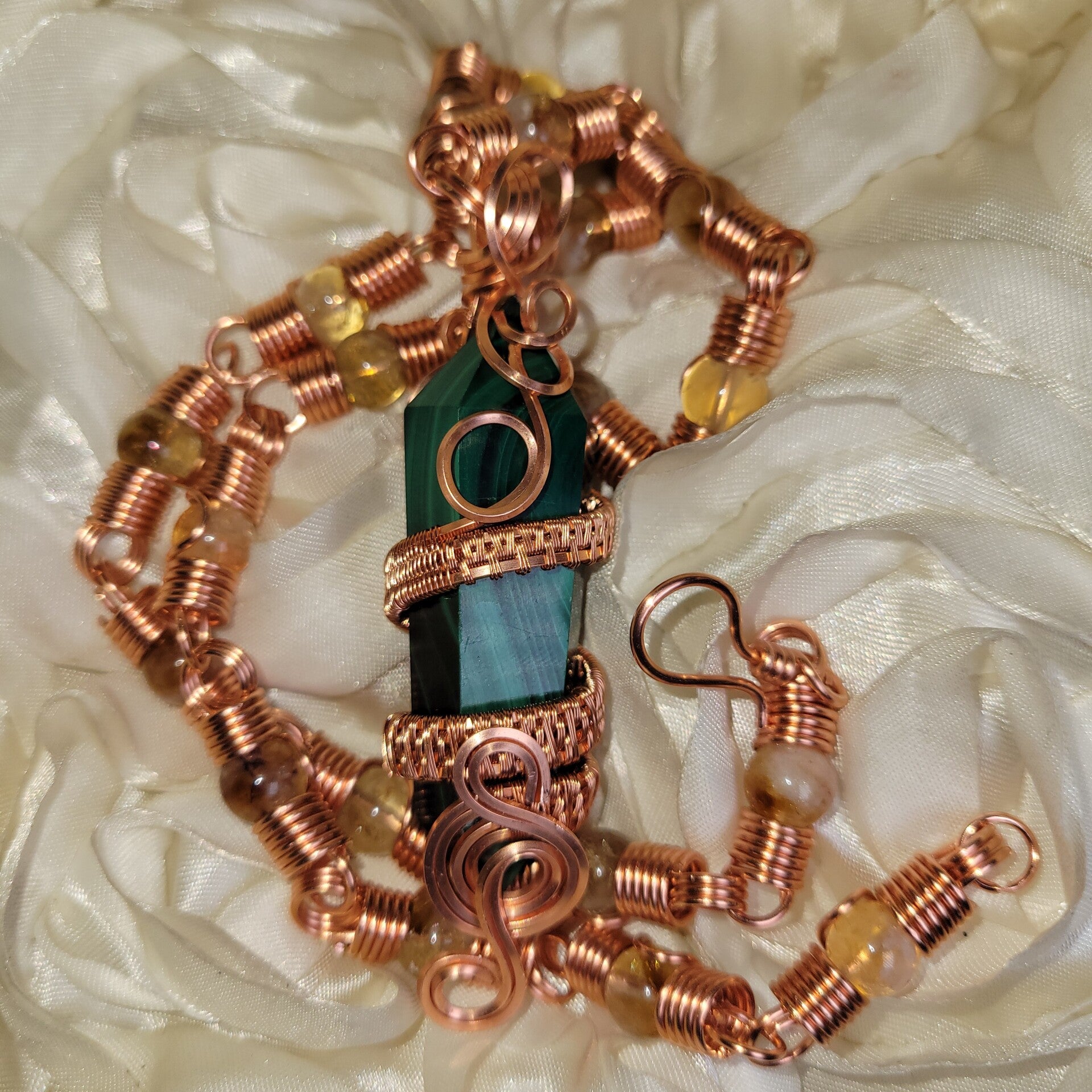 Maréziah is a striking Double Terminated Malachite pendant adorned with Citrine beads and wrapped in flowing copper, created to embody movement, duality, and transformation. Her double terminated shape makes this piece especially powerful, as energy is believed to flow through both ends rather than holding in one fixed direction. That current is echoed in the design itself, because Maréziah has no true front or back. She can be worn either way, allowing the wearer to choose the face of the piece that speaks to them in the moment. This reversible design symbolizes balance, adaptability, and the truth that transformation is never one-sided.